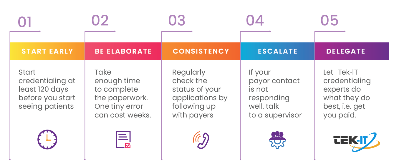 Free yourself from all the worries, piles of printed material, and perplexity with the insurance agencies. TEK-IT are credentialing specialists going above and beyond to explore the troublesome procedure of provider credentialing. TEK-IT gives providers credentialing administration at an unparalleled cost. Our service also incorporates a primary source check. We work on behalf of physicians and specialties at the same time.